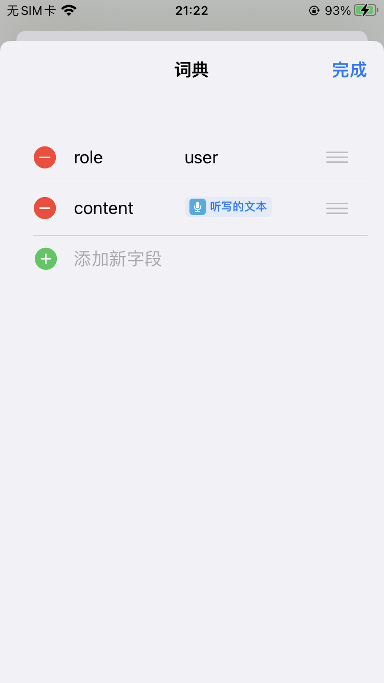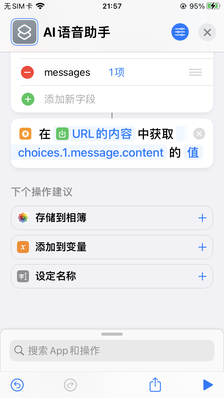 搜索“获取词典值”,因为返回的内容是JSON格式,所以选择“获取词典”。接下来,我们需要根据返回的数据结构,解析出我们需要的内容content。通过观察发现,content位于choices数组的第一个对象的message中,具体路径是choices[0].message.content。在快捷指令中,对应的路径是choices.1.message.content。