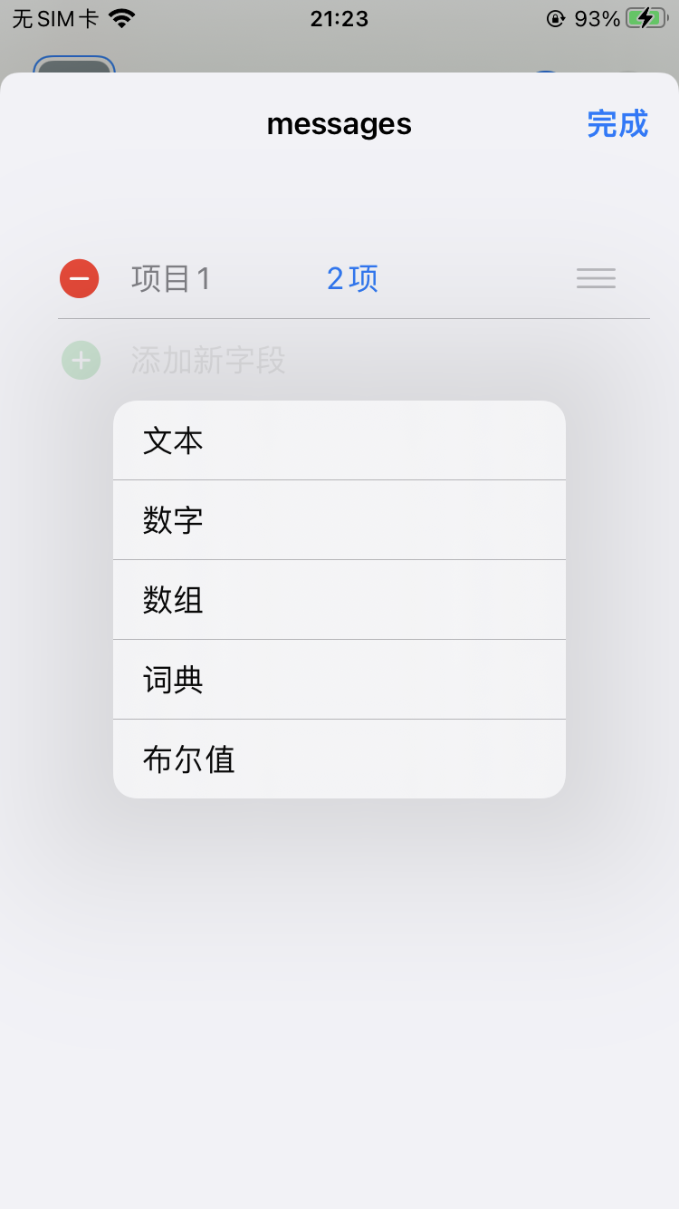 messages时,messages的类型要选择“数组”,messages里面的项目要选择“词典”,词典里面的内容选择“文本”。