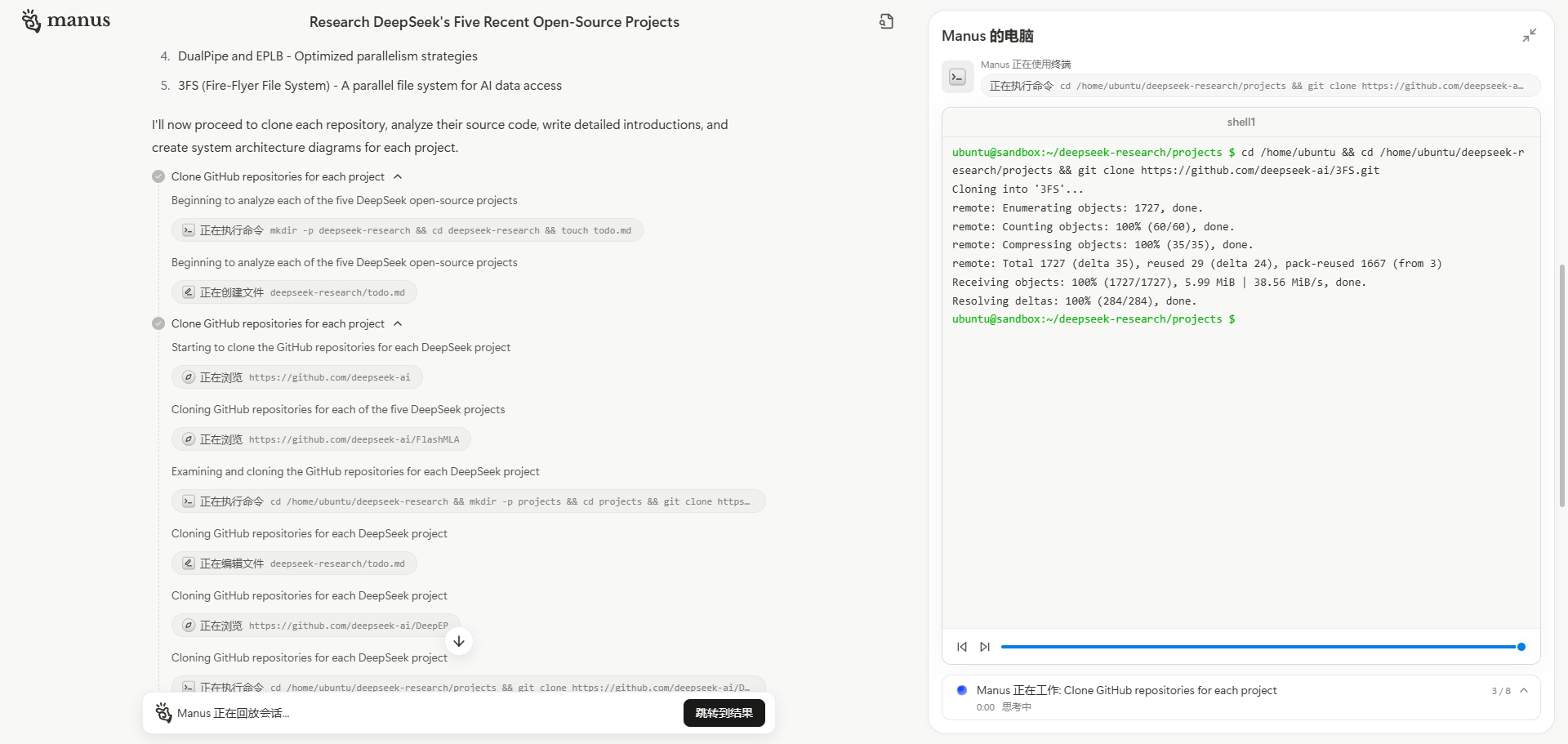 总之,Manus 不仅仅是一个只会聊天的对话式 AI 工具,而是一个真正的自主智能体(Agent)。当其他 AI 可能只停留在生成想法的阶段,而 Manus 能够独立思考并采取行动。Manus在接到用户指令后可以直接操作电脑完成一系列报告撰写、表格制作、代码调试等工作,并在最后导出符合用户需求的产品。