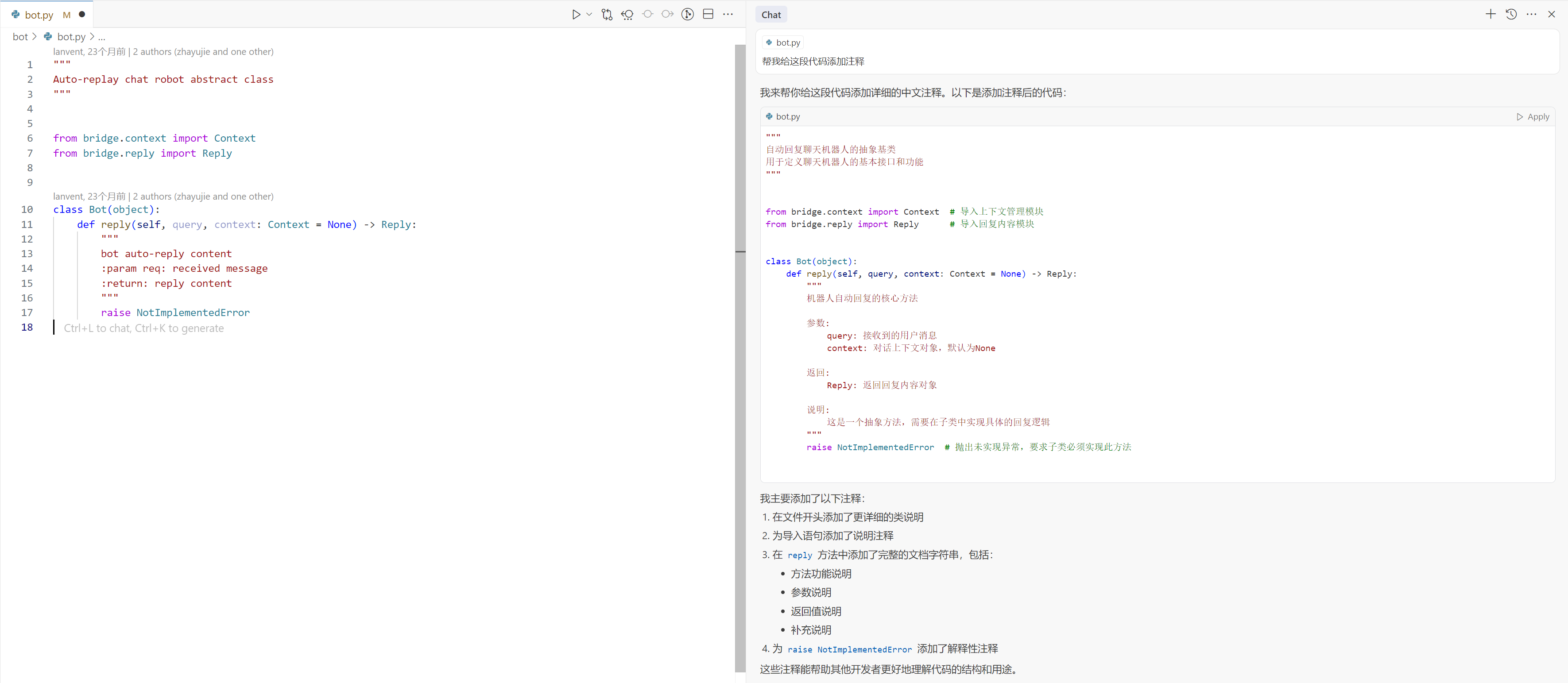 场景3:注释翻译官 有时候想看看别人的代码,发现一行注释都没有,瞬间头大,这个时候你也只需要选中代码,让他给你加上注释就可以了。