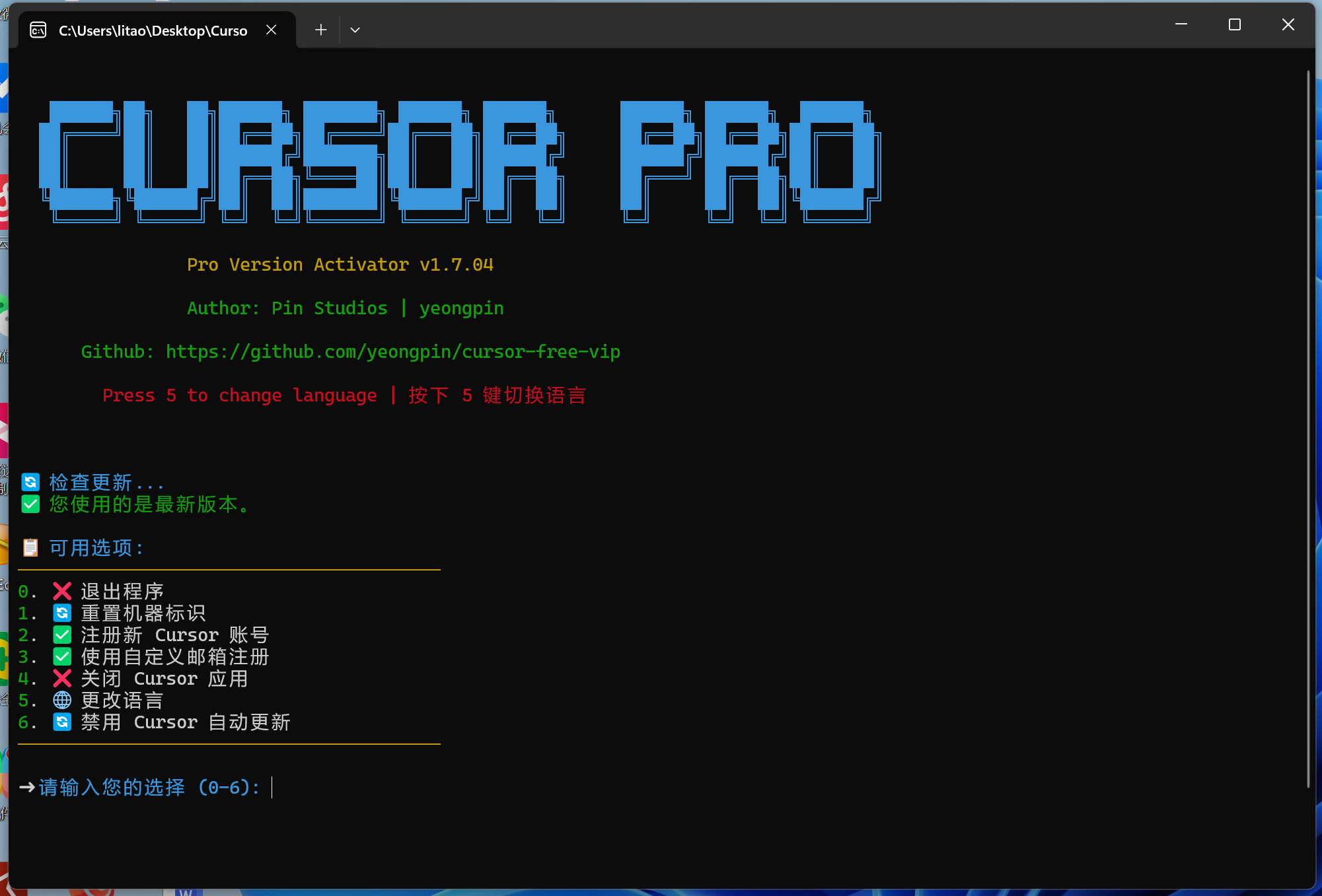 irm https://raw.githubusercontent.com/yeongpin/cursor-free-vip/main/scripts/install.ps1 | iex配置文件,Win / Macos / Linux 路径, [Documents/.cursor-free-vip/config.ini]