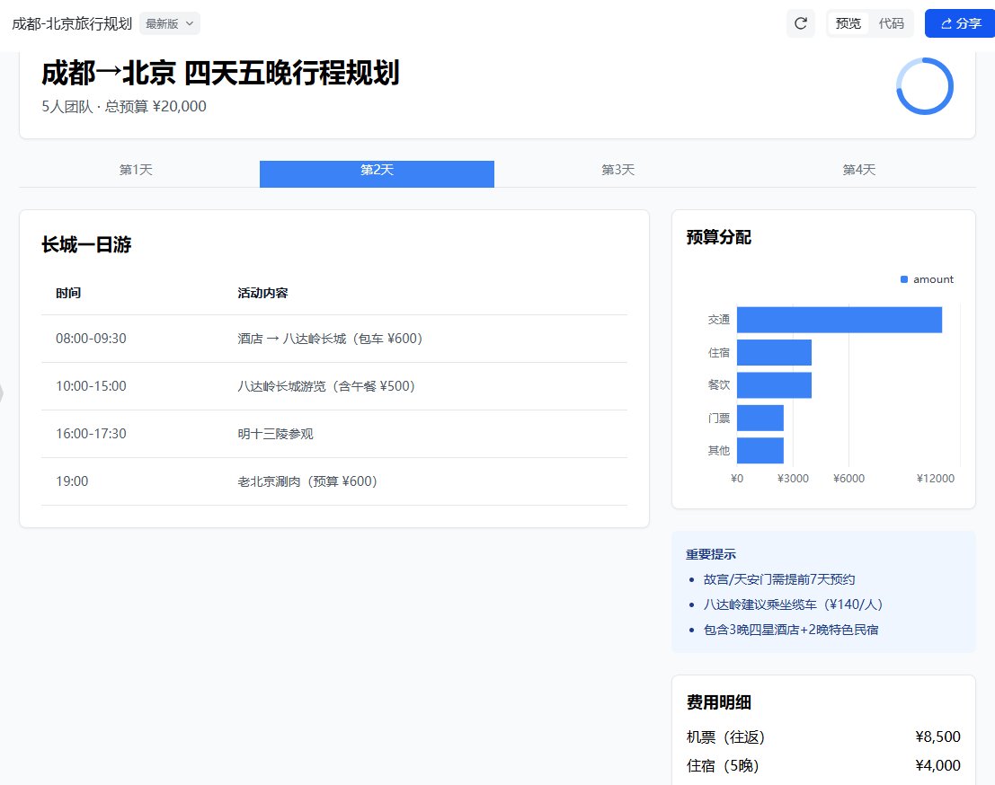 请帮我做一个成都到北京,4天5晚,5人,预算2w元的旅行规划,请用网页展示规划结果效果: