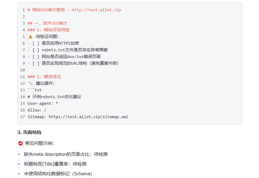 对网站(http://test.ailot.vip/)进行彻底的搜索引擎优化审计,并提供详细的优化报告和可操作的建议。