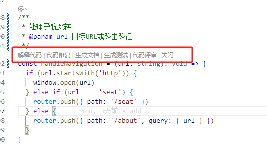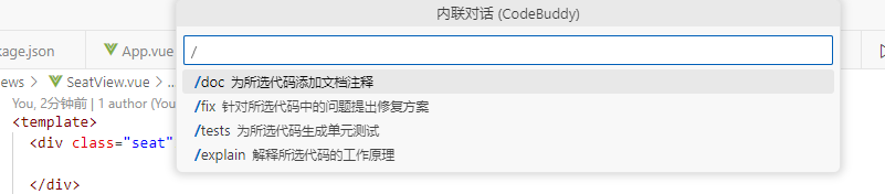/fix:修复选中代码/doc:添加注释/tests:生成单元测试/explain:生成代码注释