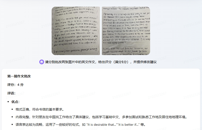 - 解析手写数学题照片时,会标注"第三行疑似抄错题"