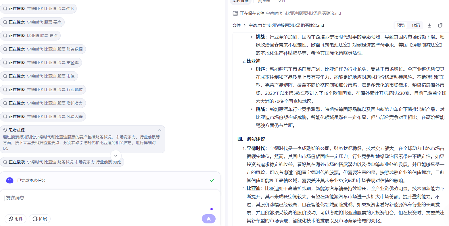 场景2:股票分析报告(对比宁德时代 vs 比亚迪的股票,并给出购买建议)
