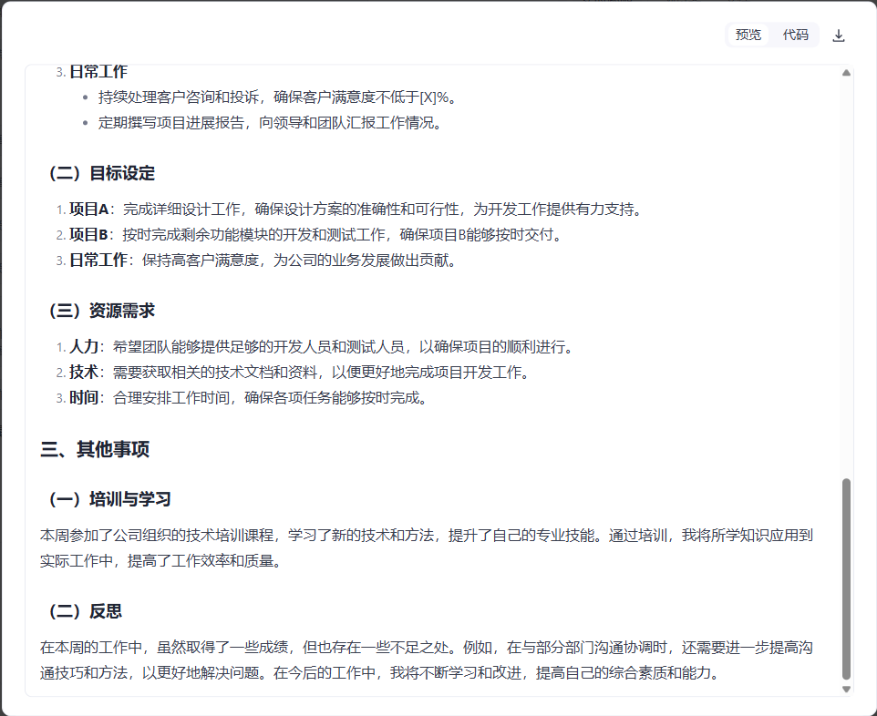 场景3:周报生成(本周不知道干了啥事情,帮我写一份周报,要突出"任务很多,贡献很大")