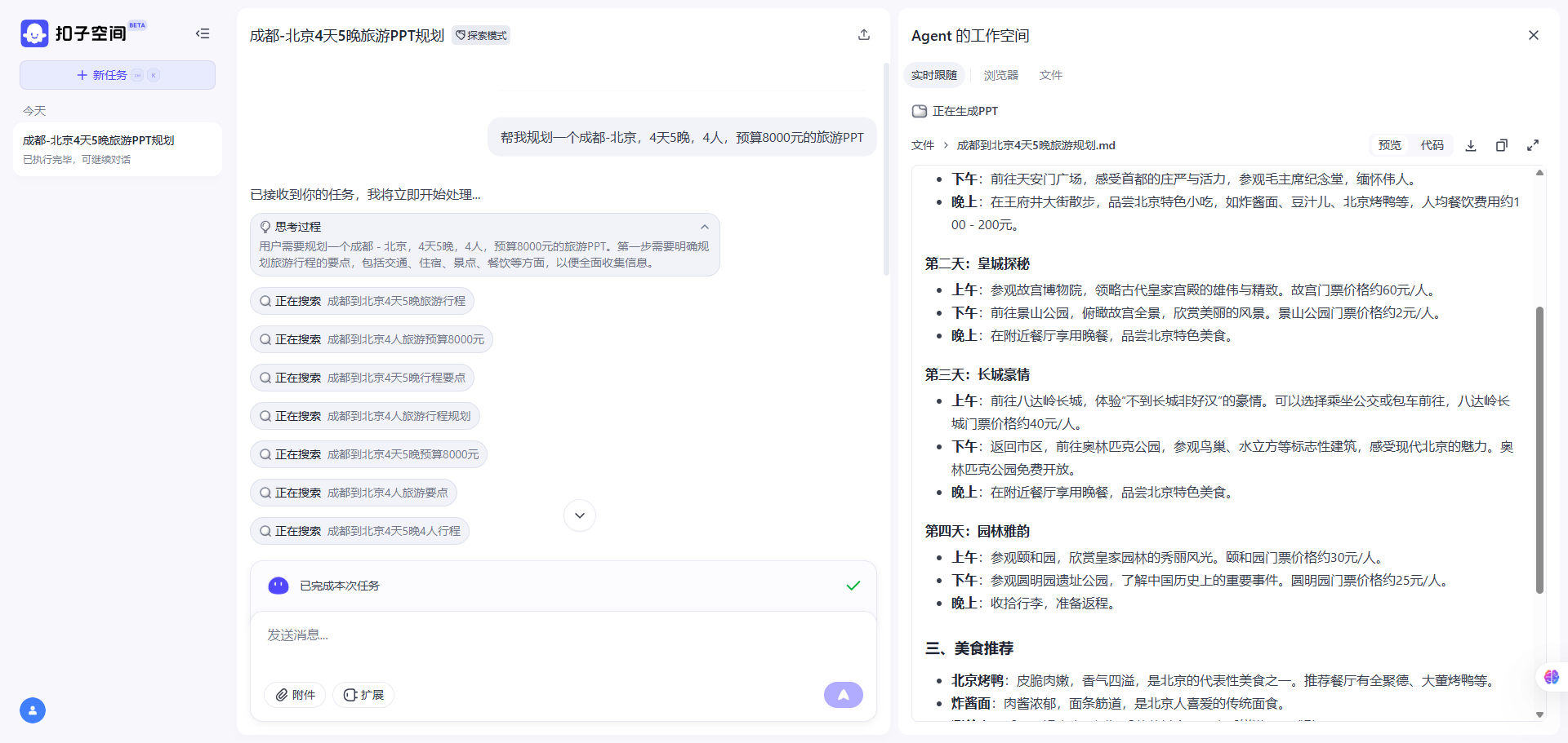 扣子空间: 15分钟自动完成景点分析、路线规划、预算表等