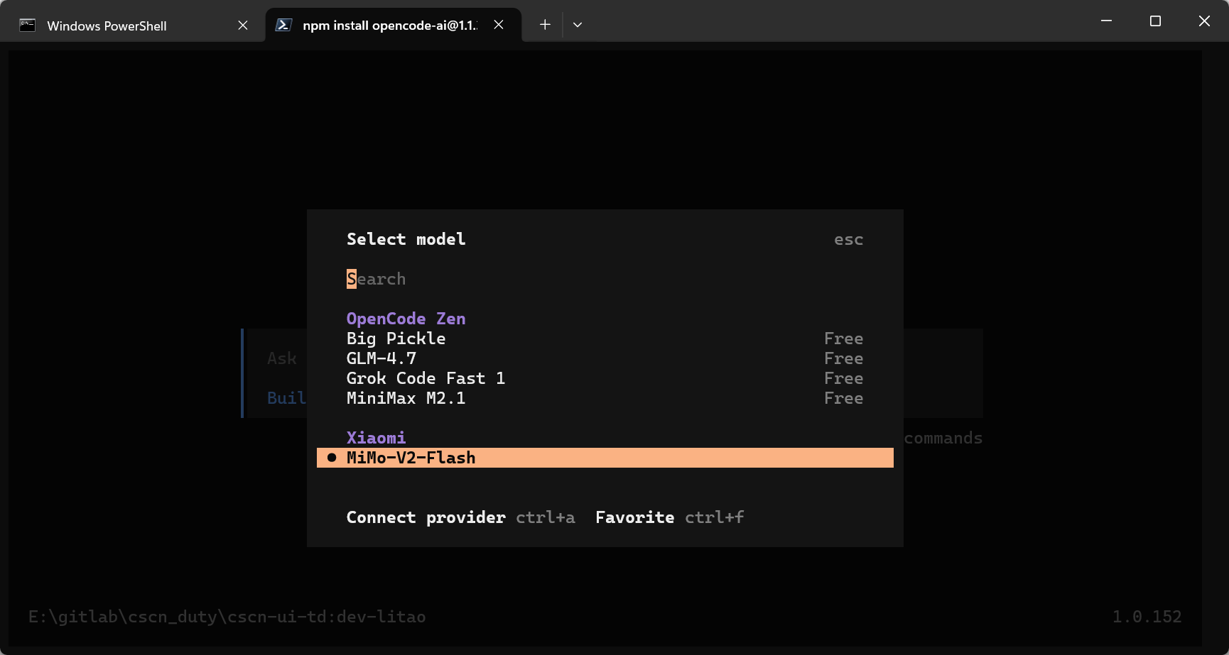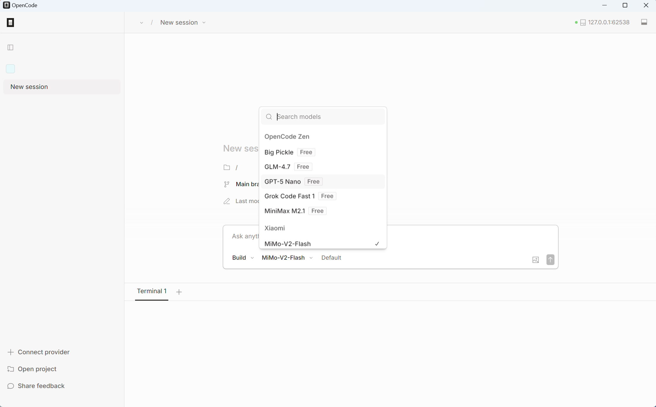 opencode命令,或通过桌面图标启动桌面端。 - 选择模型:终端模式输入