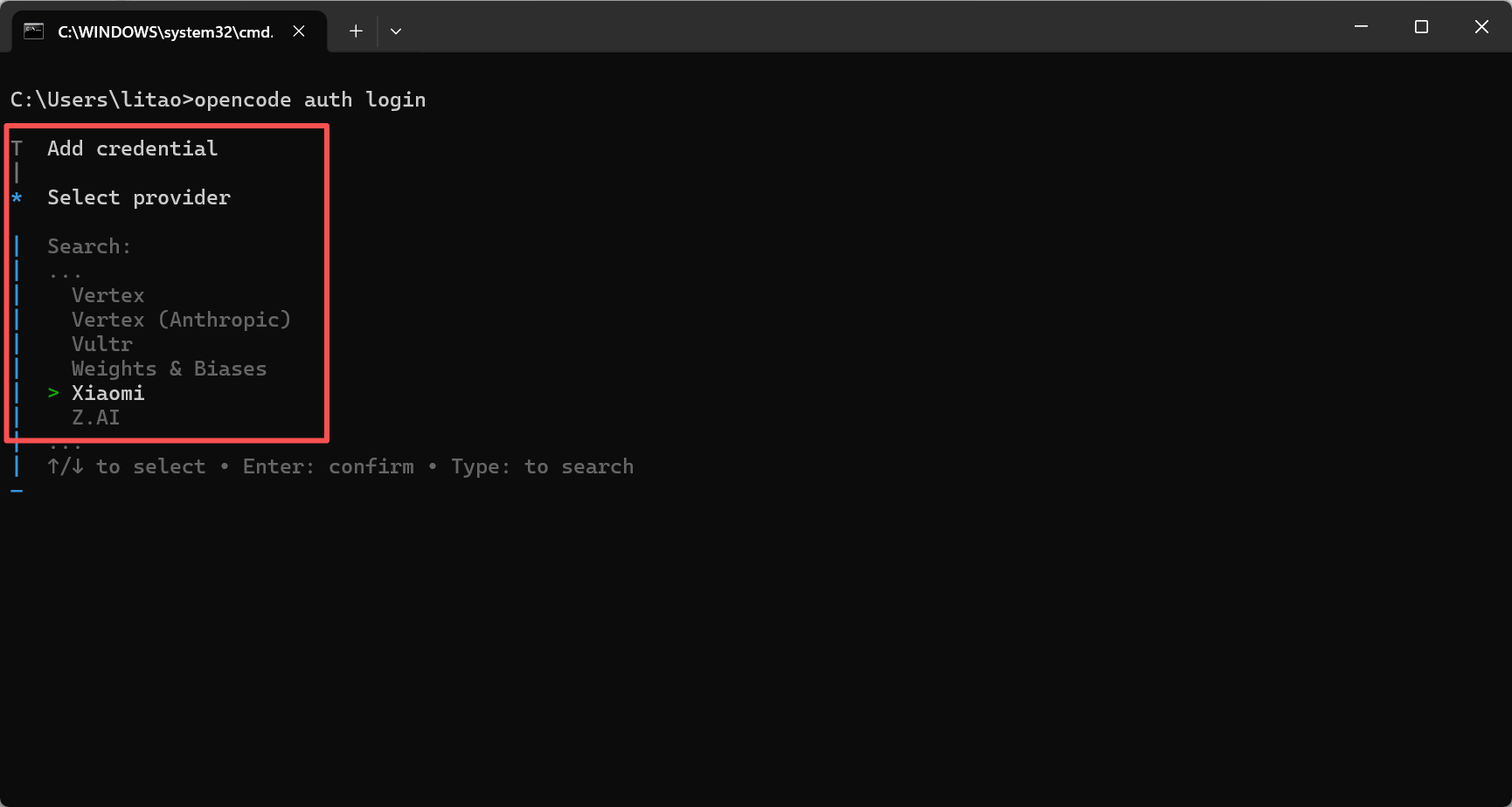 opencode auth list | 列出已登录账户 |