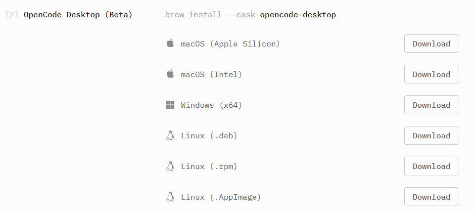 访问 OpenCode 官方下载页面(https://opencode.ai/download),根据操作系统选择对应的安装包进行下载和安装。
