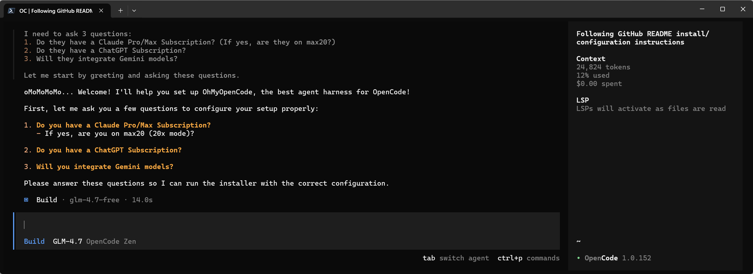 插件安装过程已高度自动化。启动 OpenCode 后,将以下安装命令粘贴到会话中,Agent 将自动完成配置过程,用户仅需根据提示确认即可: