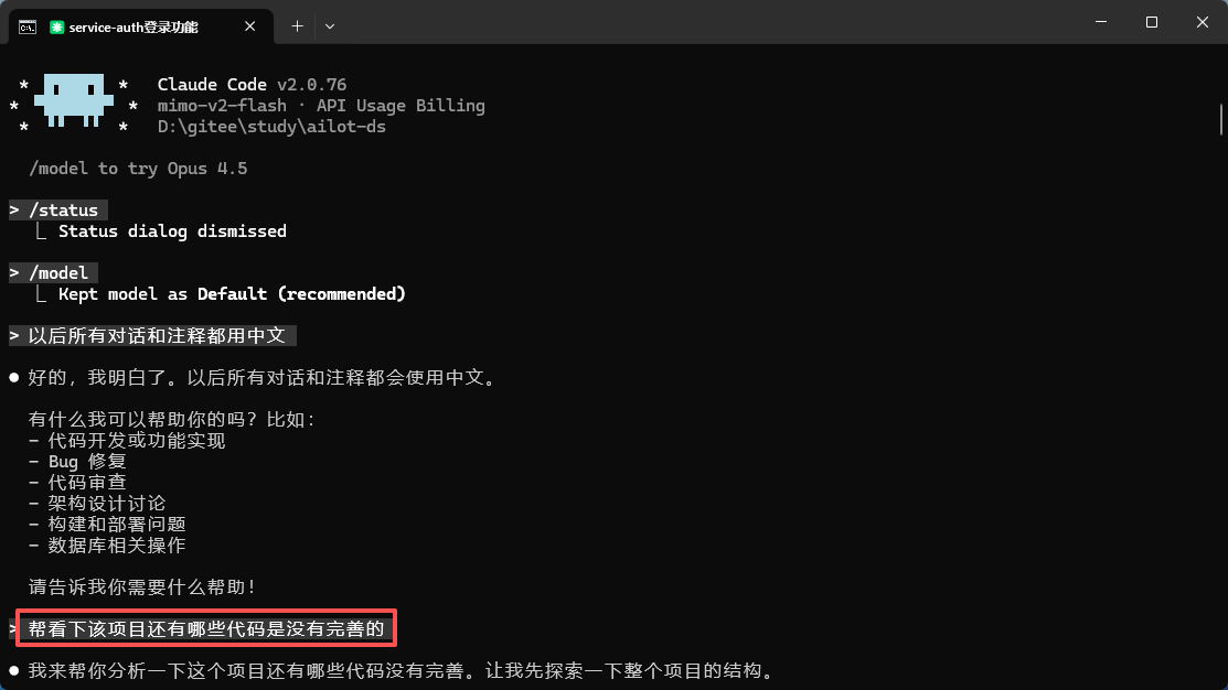 今天的任务是:给它一个项目,让它自己分析,并完成我没有完成的工作,嘿嘿!!!
