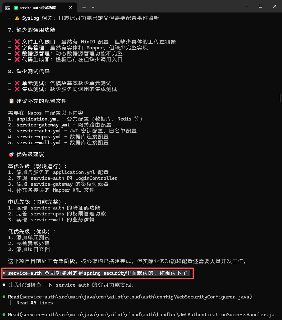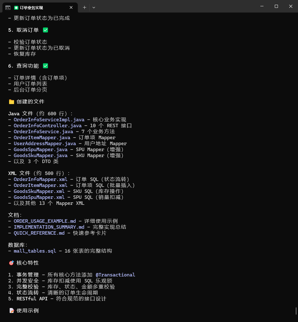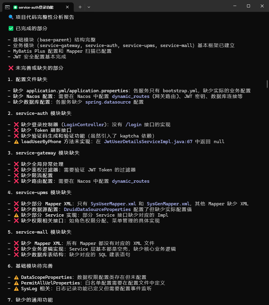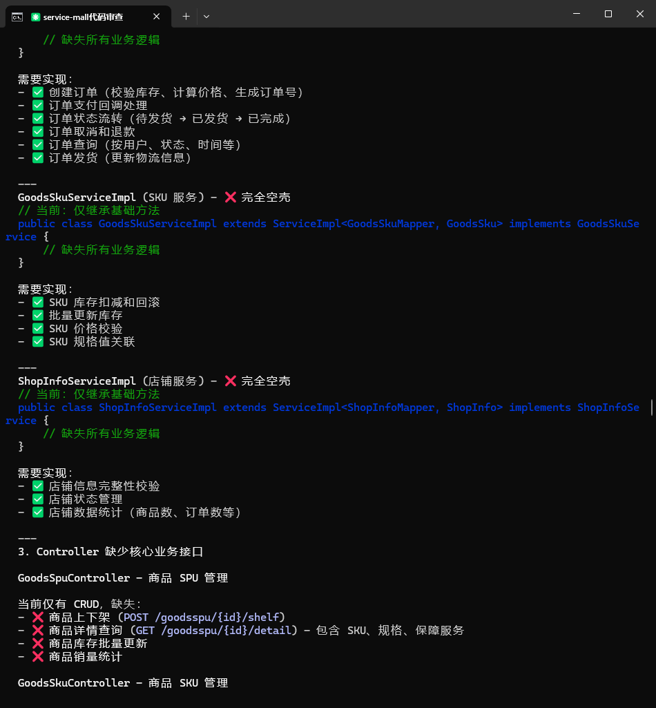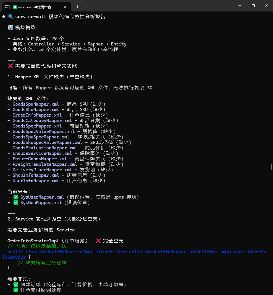 接着我针对商城模块让它帮我分析,也是很快就出结果了: