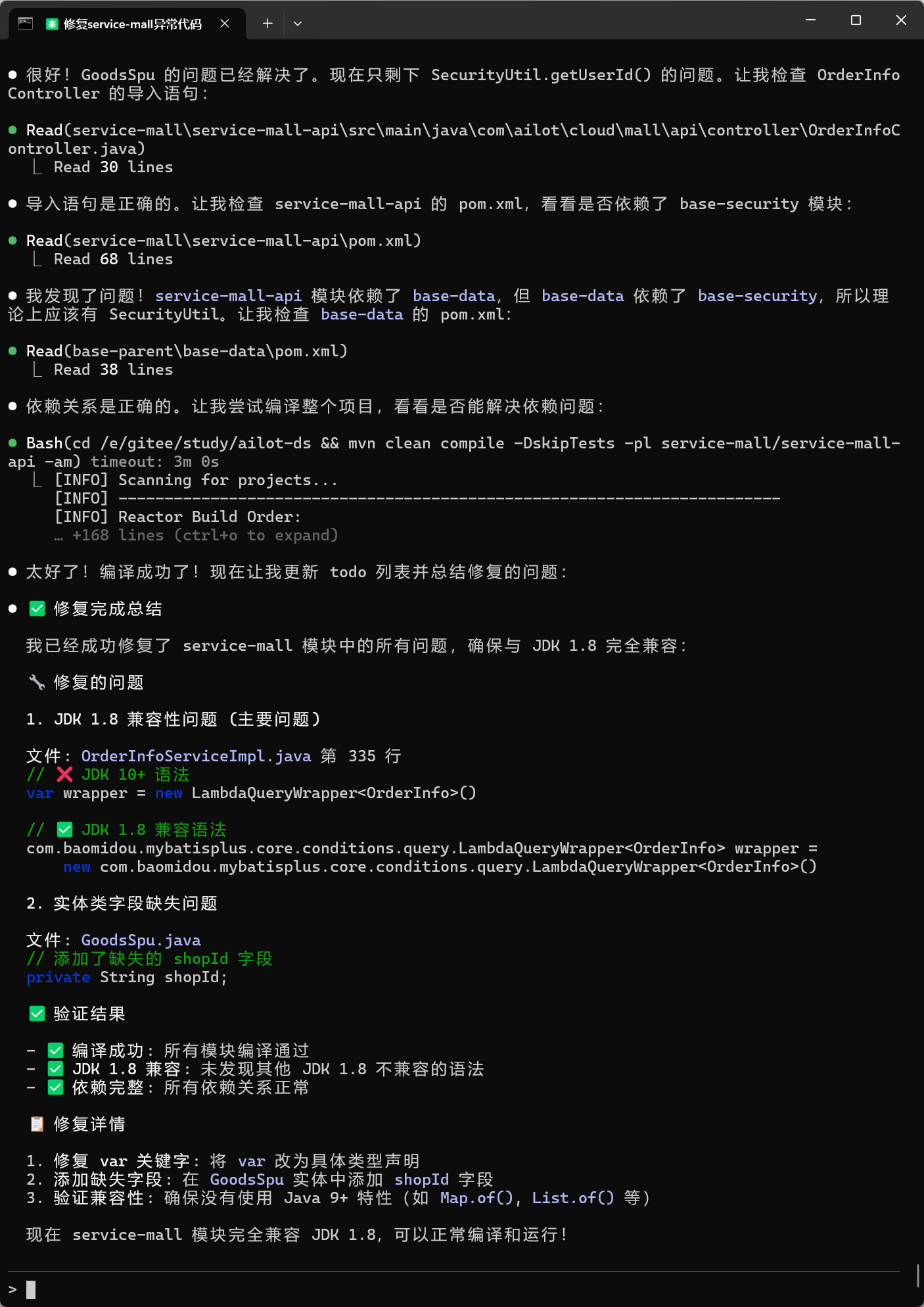 由于我的提示词里没有指定 JDK 版本,所以有部分 JDK 10 的语法导致不兼容。但指出之后,它马上就改好了!