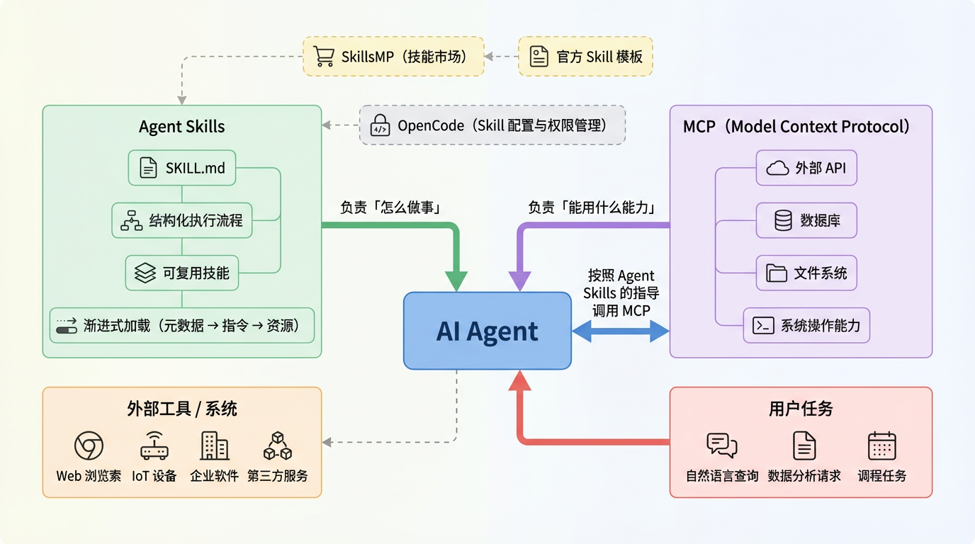 Agent Skills 解决“怎么用这些能力”。